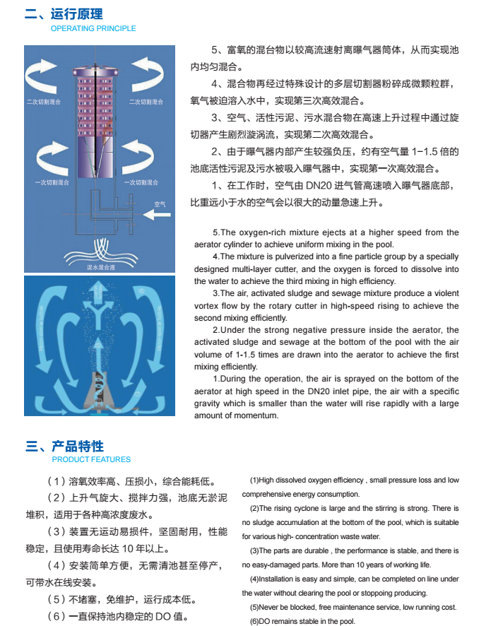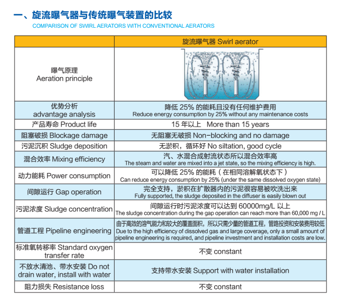 我公司改進后的可晉升式旋流曝氣器不只擔當了傳統旋流曝氣器不易梗塞的長處,并且降服了傳統旋流曝氣器建造本錢高的缺點,集氛圍和水旋混、屢次破壞、切割于一體,充實操縱了動能,不需額定增添攪拌能源,攪拌機能好,是以發生的氣泡平均,氧操縱率高。